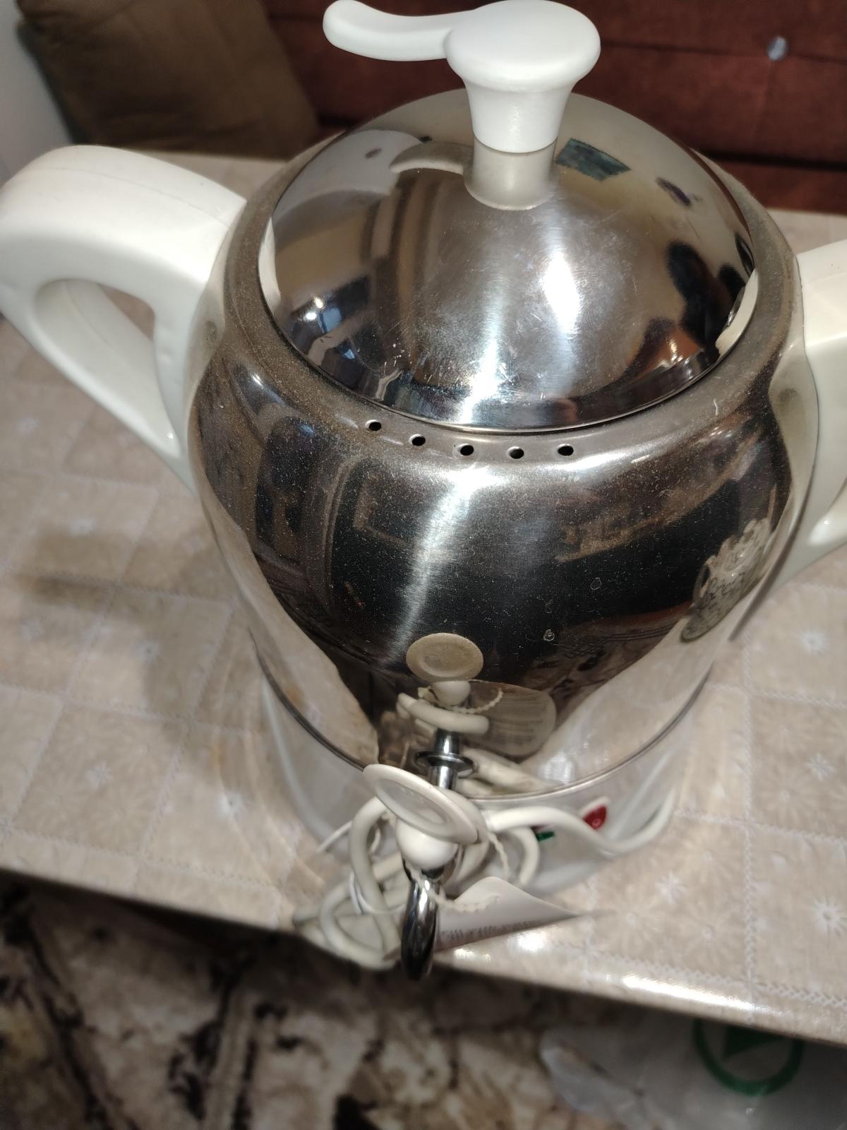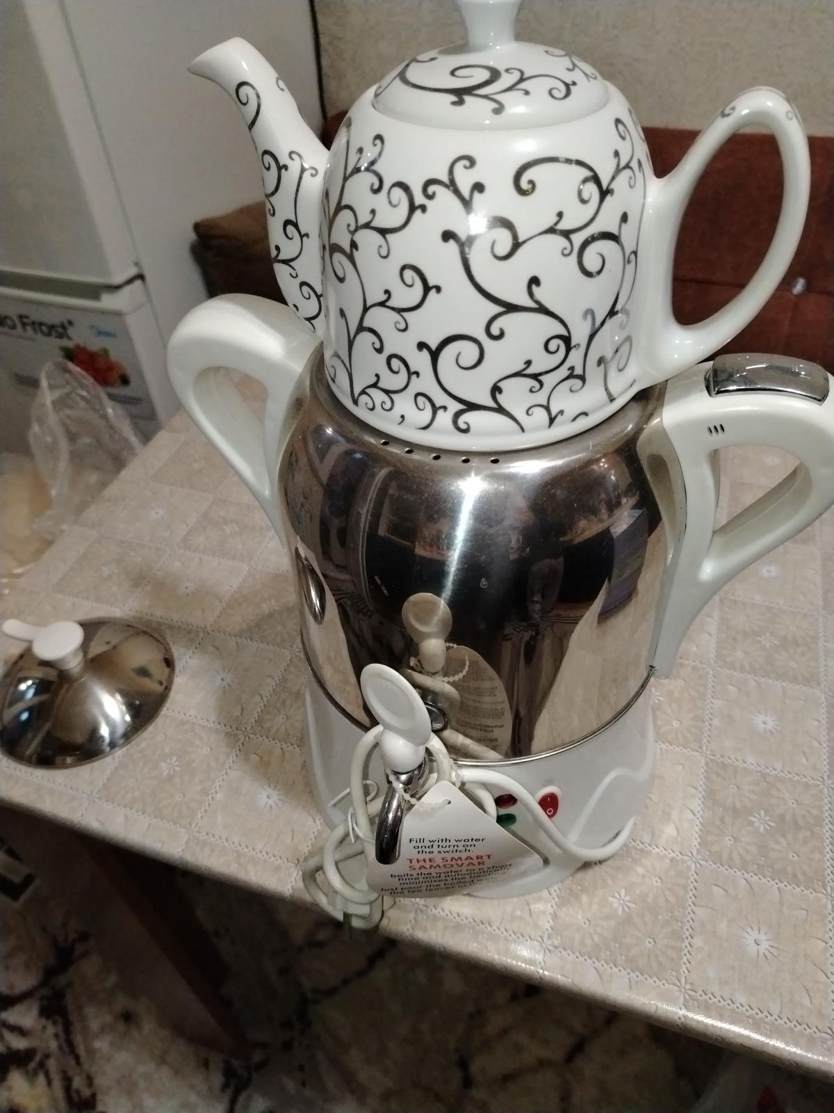 Ağıllı elektrik samovarı və çini çaydan dəsti Xüsusiyyətlər: - “The Smart Samovar” – sürətlə su qaynadır və avtomatik olaraq isitmə rejimini minimuma endirir. - Paslanmayan poladdan korpus, iki tərəfli tutacaqlar. - Üzərində işıq indikatorları (qırmızı/yaşıl) – işə düşmə və saxlama rejimini göstərir. - Kranlı çıxış – fincana rahat süzmə. - Yuxarı hissədə naxışlı çini çaydan (qapaqlı) – dəmlik kimi istifadə üçün. - Ayrı metal qapaq daxildir (dəmlik istifadə olunmadıqda samovarın üstünü örtmək üçün). - Şəbəkə kabeli ilə. İstifadə qaydası (etiketdə göstərildiyi kimi): - Su ilə doldurun və düyməni yandırın. - Qaynadıqdan sonra qurğu isitmə rejiminə keçir, suyu isti saxlayır. - Qaynar suyu çaytikanın/dəmlikin üzərinə əlavə edib dəmləyin. Mətbəx, ofis və qonaq qəbulunda rahat çay süfrəsi üçün praktiki həll
